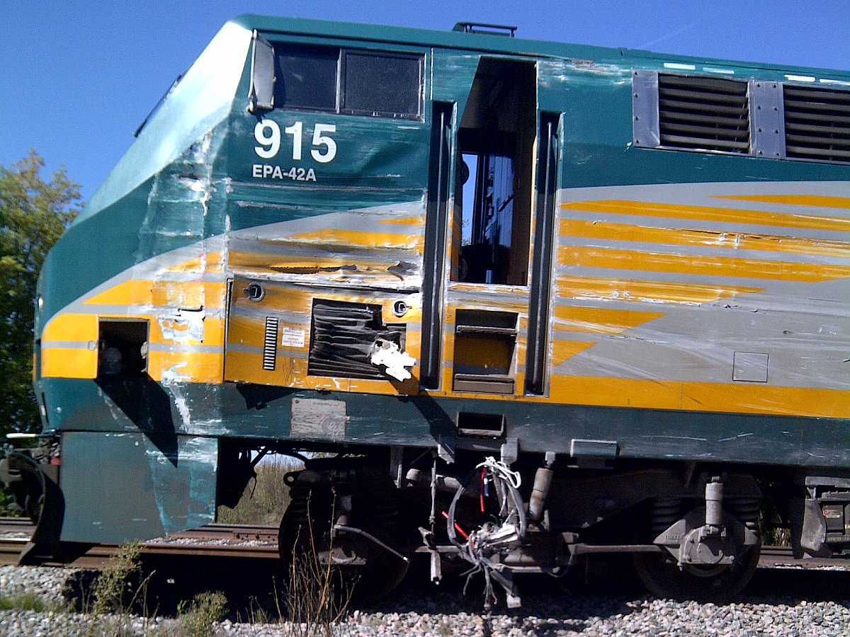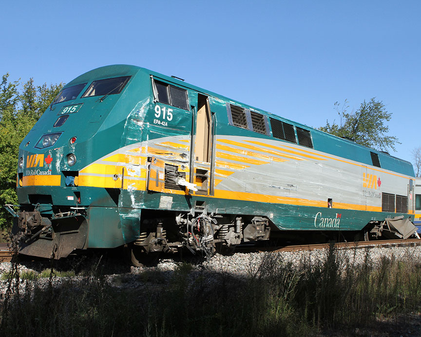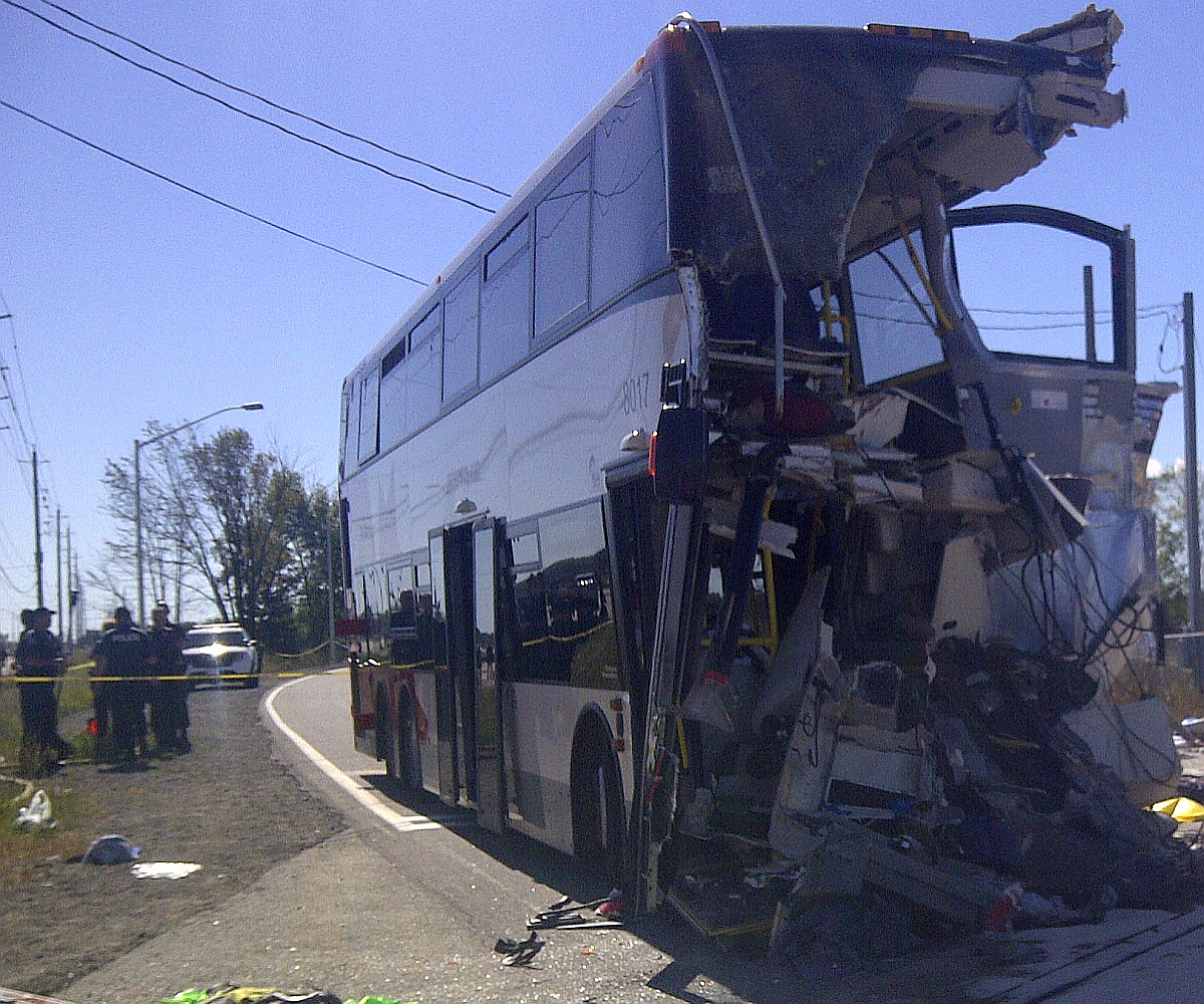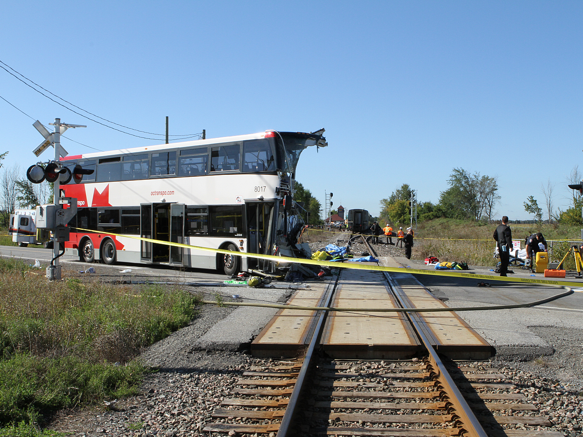 On 18 September 2013, at about 0832 Eastern Daylight Time, westward VIA Rail Canada Inc. (VIA) passenger train No. 51 departed from the VIA Ottawa Station on time and proceeded en route to Toronto. At 0847:27, OC Transpo double-decker bus No. 8017 departed from the Fallowfield Station on the OC Transpo bus Transitway. At 0848:06, while proceeding at about 43 mph, the train entered the OC Transpo Transitway crossing, located at Mile 3.30 of VIA’s Smiths Falls Subdivision. At the time, the crossing lights, bells and gates were activated. The northbound bus was travelling at about 5 mph with the brakes applied when it struck the train. As a result of the collision, the front of the bus was torn off. The train, comprising 1 locomotive and 4 passenger cars, derailed but remained upright. Among the bus occupants, there were 6 fatalities and 9 serious injuries, and about 25 minor injuries were reported. No VIA crew members or VIA passengers were injured.
