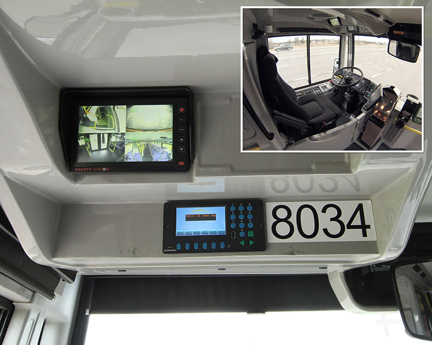 - Within the driver workstation, a small video monitor (6” (15 cm) wide by 3 ¾” (10 cm) high) is located on the left side of a forward panel above the driver seat which creates a significant upwards viewing angle for the driver.