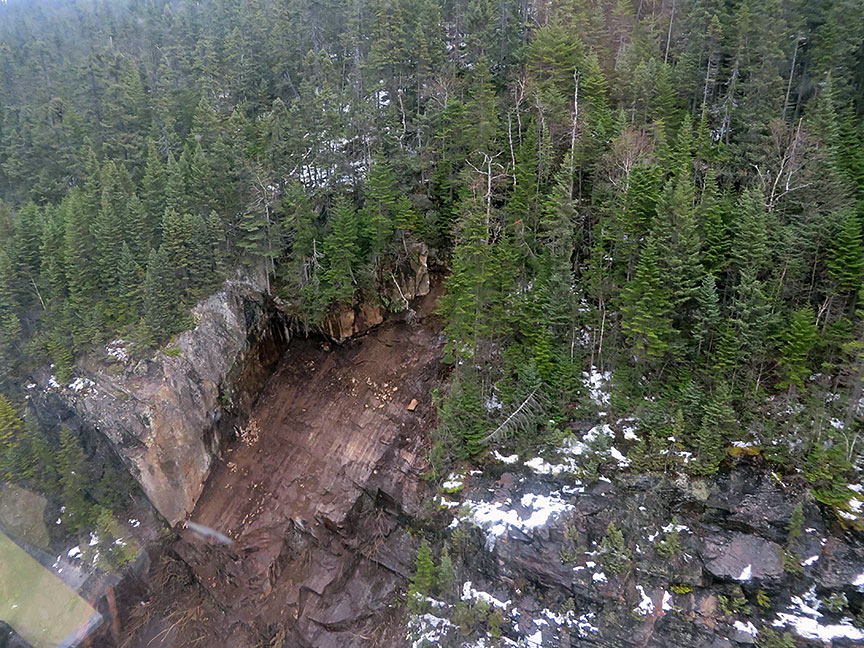 On , at approximately 0540, Eastern Standard Time, Quebec North Shore and Labrador Railway ore train BNL-212J was proceeding northward when it struck a rock and gravel slide. The collision caused the 2 lead locomotives and the first 9 cars to derail. The lead locomotive rolled down the slope and came to a stop at the bottom of the Moisie River, completely submerged. The locomotive engineer was fatally injured. About 1000 litres of diesel fuel spilled from the locomotive. About 100 feet of railway track was destroyed.