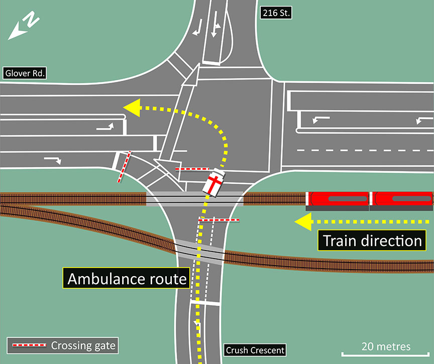 On , at approximately 1120 Pacific Daylight Time, Canadian National Railway train Q10251-11, travelling northward on the Canadian Pacific Railway Page Subdivision, collided with an ambulance at the Crush Crescent–Glover Road crossing (Mile 18.81) in Langley, British Columbia. The paramedic in the patient compartment and the patient suffered injuries and were airlifted to hospital. The driver was transported to hospital, treated, and released. The patient later died of injuries sustained in the accident