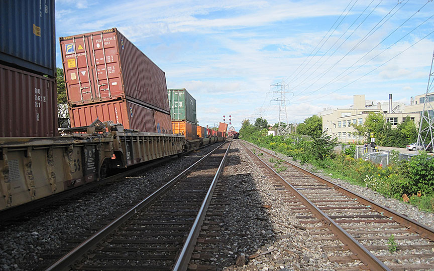 On 21 August 2016, at approximately 0517 Eastern Daylight Time, Canadian Pacific Railway freight train 118-18 was crossing from the north to the south track at approximately Mile 3.3 on the North Toronto Subdivision in Toronto, Ontario. Freight train 235-21, proceeding westward with 2 locomotives only, collided with the tail end of train 118-18. Four of train 118-18's intermodal cars (10 platforms) were struck and damaged. Four of the platforms derailed upright. The 2 locomotives of train 235-21 derailed upright. The fuel tank on train 7235-21's lead locomotive was punctured, resulting in the release of about 2500 litres of diesel fuel. A number of small fires were extinguished. The conductor of train 235-21 sustained injuries.