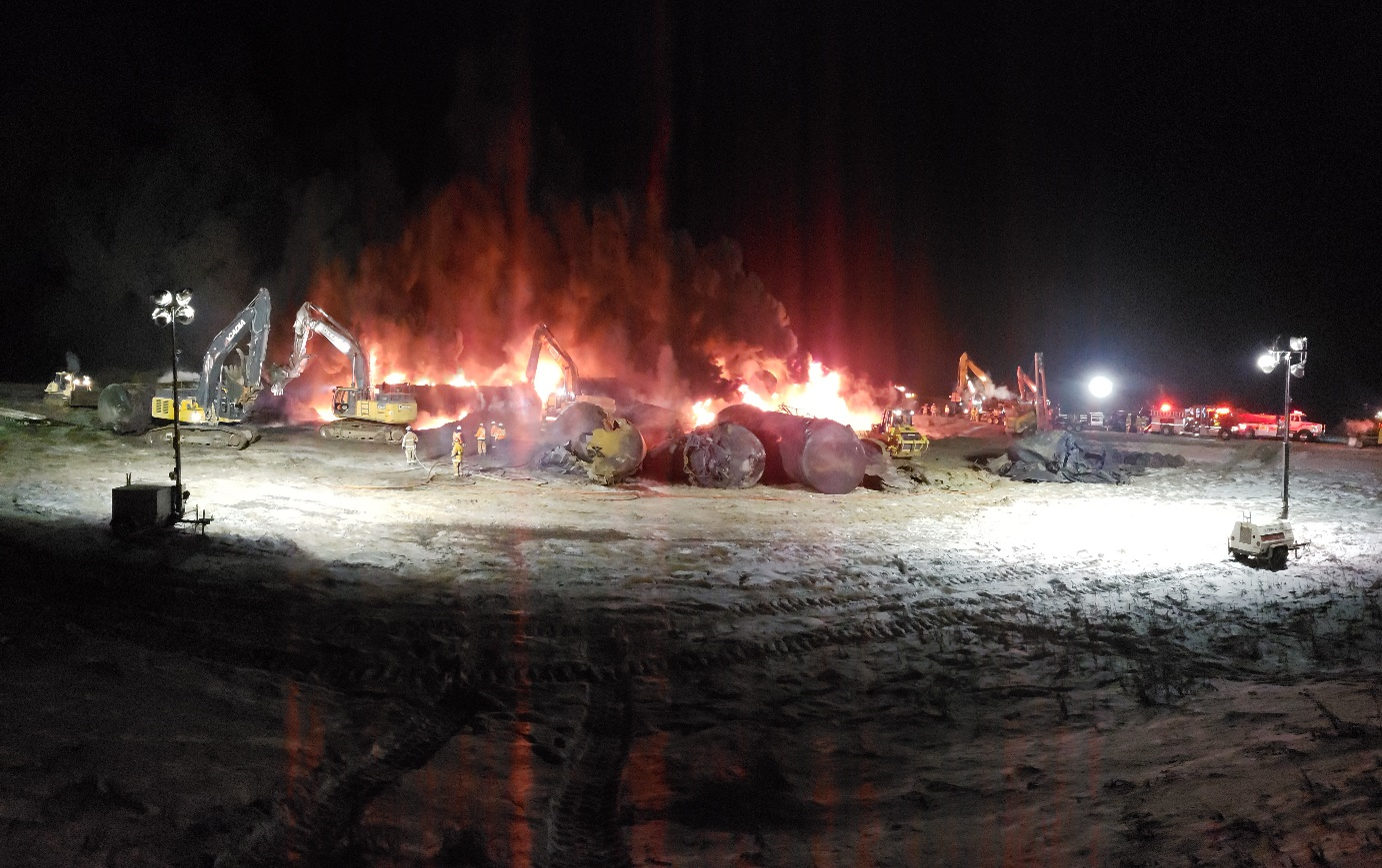 It is estimated that a total of approximately 1.77 million litres of petroleum crude oil was released to the surface and atmosphere, which was about 57% of the total volume that was transported in the 33 derailed tank cars.
