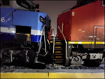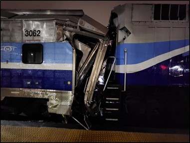 On 21 November 2023, at approximately 1827 Eastern Standard Time, Canadian National Railway Company train X37621-20 (CN 376), a light engine movement, was travelling southward on the east track of the St-Laurent Subdivision when it collided at 32 mph with the tail end of a stationary Réseau de transport métropolitain commuter train (EXO 1212). At the time of impact, the train EXO 1212 was stopped at Saint-Léonard–Montréal-Nord station (Mile 135.89) in Montréal, Quebec. Four of the 8 passengers on board train EXO 1212 and the 2 crew members of this train received minor injuries. The 2 crew members of train CN 376 were not injured. Locomotive EXO 1346 and passenger car EXO 3062 were damaged, as were the 2 locomotives on train CN 376.