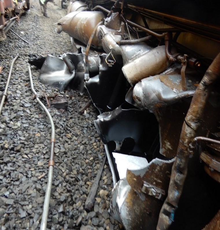 As a result, 2 intermodal cars on the southbound train derailed on their side. Both lead locomotives and 5 cars on the northbound train also derailed. Three of these cars, which contained dangerous goods, derailed in an upright or leaning position. A fuel tank on the lead locomotive was ruptured, spilling an estimated 8000 litres of diesel fuel.