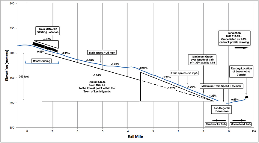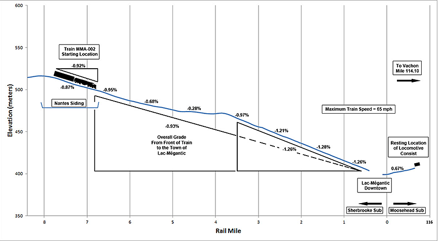 The last 3.5 miles leading to the town of Lac-Mégantic had an average grade of -1.26%.