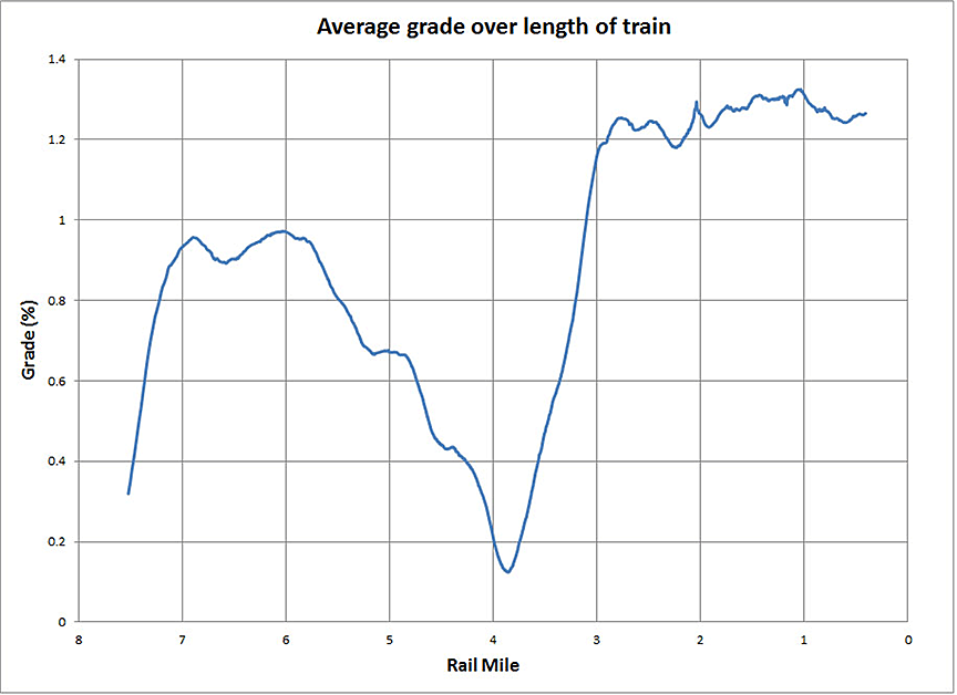 From the plot it can be seen that the steepest portion of the track is the last 3.5 miles leading to the town of Lac-Mégantic with a grade averaging -1.26%. The maximum grade, averaged over the length of the train, was 1.32% and occurred at mile 1.03 on the Sherbrooke Sub.