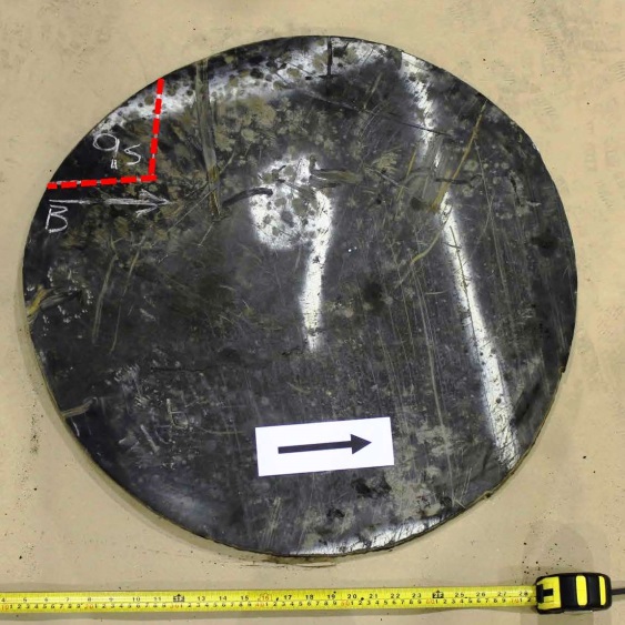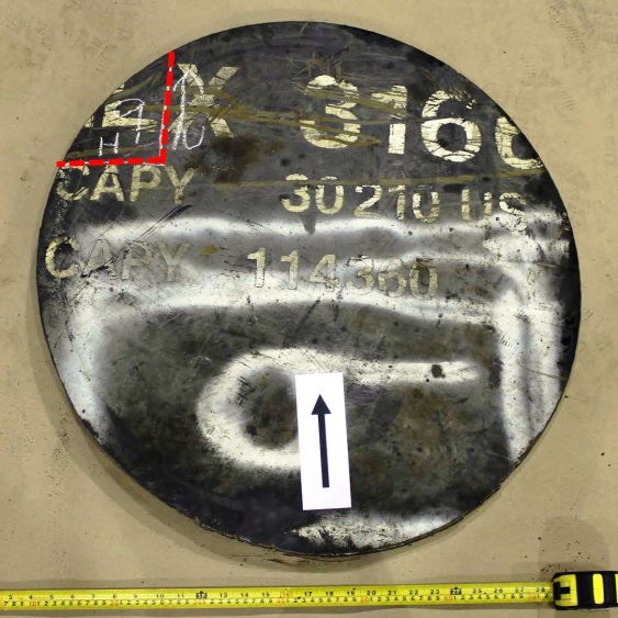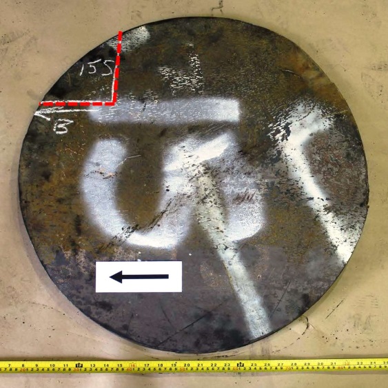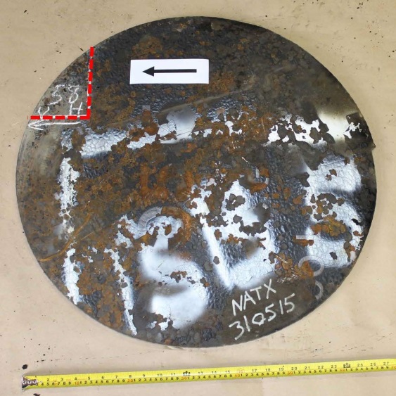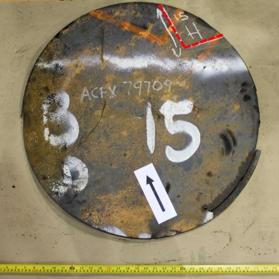 Figures 1 through 9 are photographs that show the coupons as marked on the cars. Coupons were taken from locations with as little impact and fire damage as possible, except for car WFIX 130571 from which a coupon was purposely taken from an area with extensive fire damage that contained a burn-throughFootnote 4 (Figure 6). The marked sections of cars were cut out using hydraulic shears before the cars were scrapped. Since hot work was not permitted on the occurrence site due to the fire hazard, an external company was contracted to cut circular coupons from the sheared-off sections of tank car using water-jet equipment. Figure 1a is a representative example of a sheared-off section of tank car after the circular coupon was cut out. Table 2 summarizes the identification and origin of each coupon. Figure 10 shows the water jet–cut coupons as received at the TSB Engineering Laboratory.