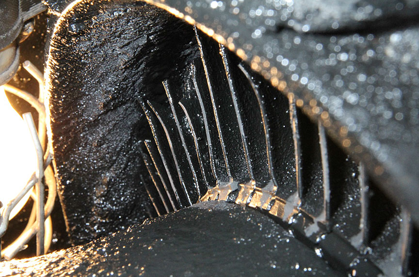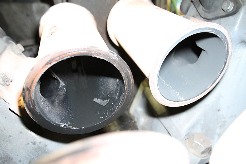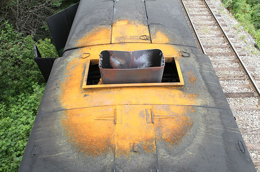 Examination of the exhaust stack and surrounding roof panels showed that the fire had been concentrated in that area (Figure 2). Fresh rust was visible where paint had been burned off portions of the roof immediately adjacent to the exhaust stack, and the stack itself was cracked. Visual inspection inside the exhaust stack indicated that the body of the turbocharger was approximately half full of a mixture of oil and water (Figure 3).