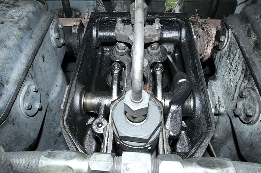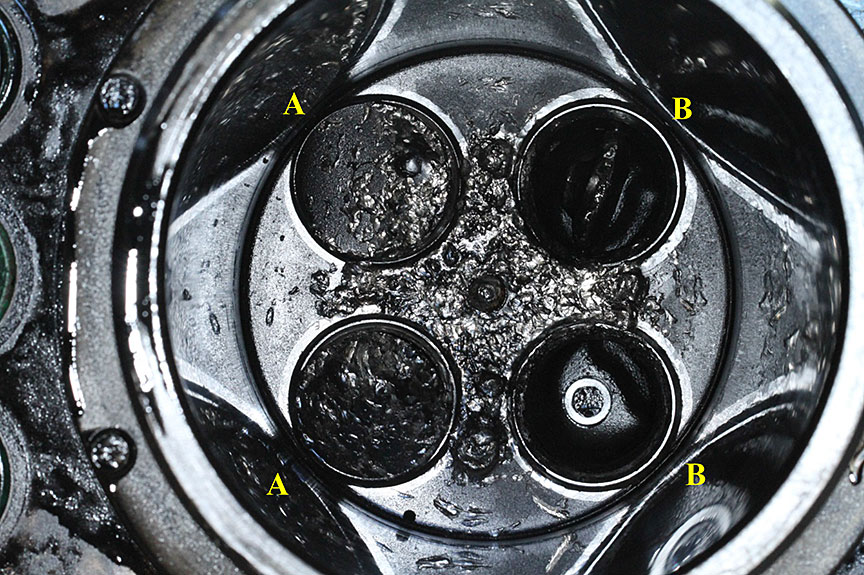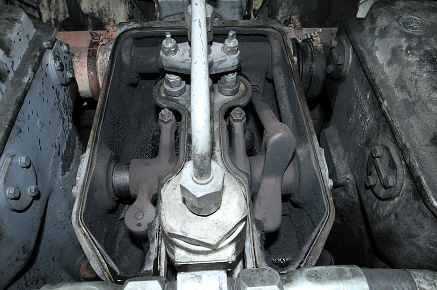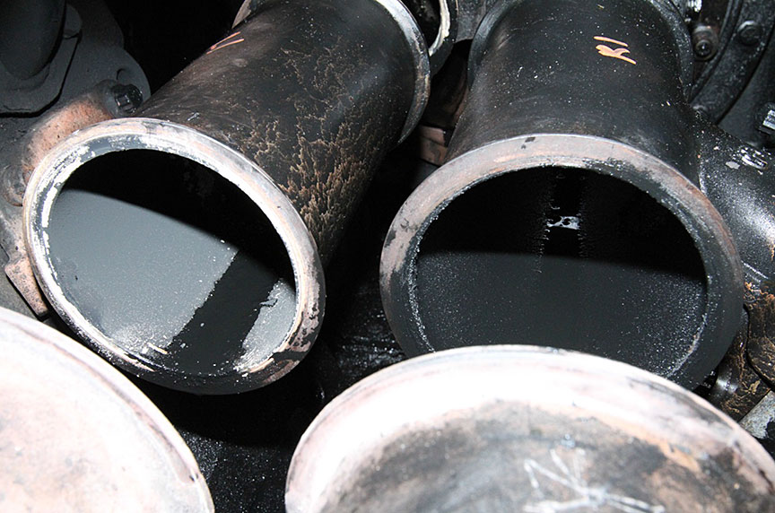 Removal of the valve covers revealed that the top of the number five power assembly on the right hand side (PA R5) was dry and coked, indicating that the valve train had been starved of oil for an extended period of time (Figure 4). The other power assemblies had a normal oily appearance (a representative example is shown in Figure 5 for comparison).