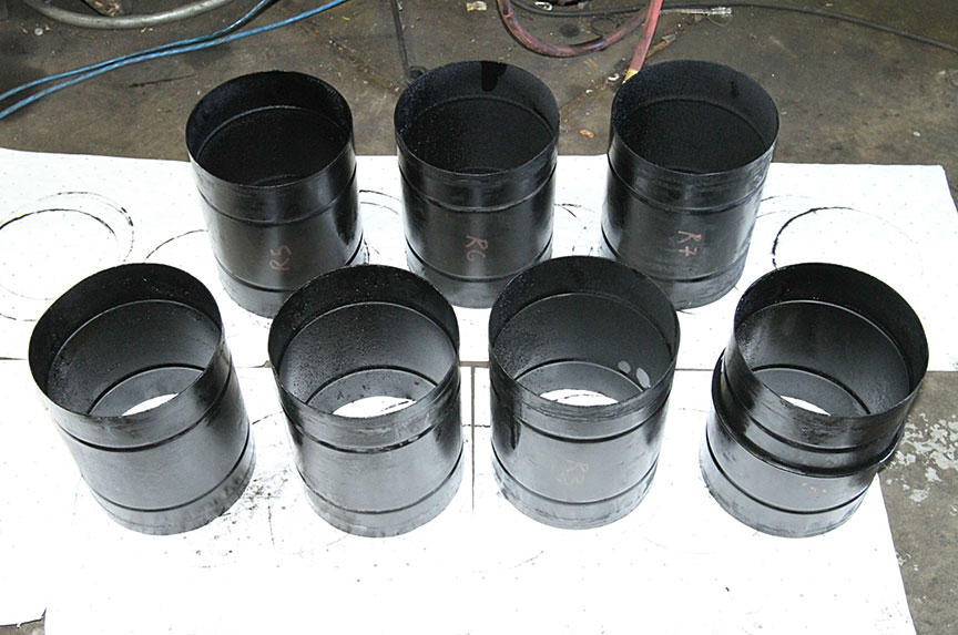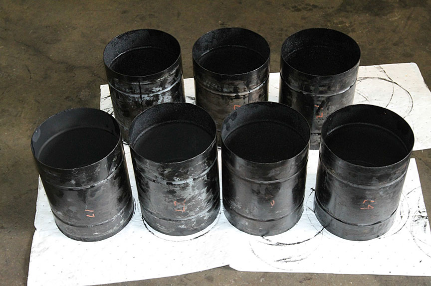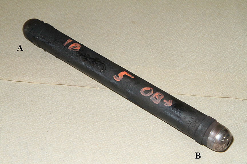 After removal of the engine bay doors, the joining tube sections of the intake and exhaust manifolds were labelled and removed. Examination of the intake manifold tube and body sections showed a gradual increase in the buildup of engine oil from the front to the rear cylinders, with a more pronounced deposit on right side cylinders (Figure 8) than on left side cylinders (Figure 9). The exhaust manifold tube and body sections showed an increase in oil buildup from the rear to the front cylinders, with a greater buildup on the right side cylinders (Figures 10 and 11). This is consistent with the direction of normal air flow through the engine. A separated valve head was observed in the transition section just upstream of the turbine (Figure 12).