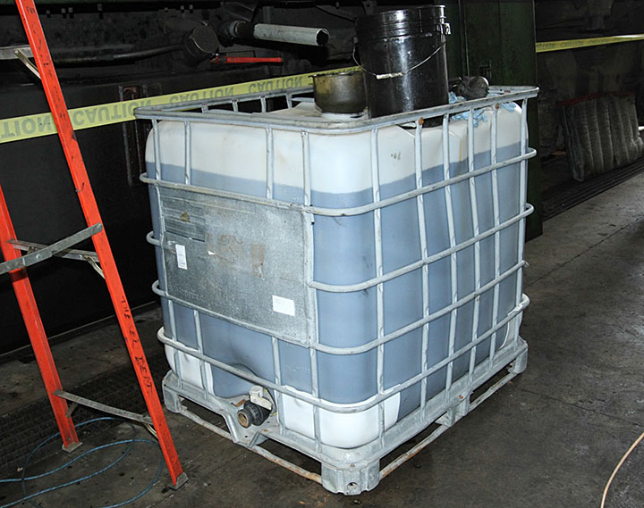The engine oil was drained into a large plastic container to estimate the volume of oil remaining in the sump (Figure 13). Approximately 250 gallons of oil were recovered. The normal full sump volume was 380 gallons, indicating the level of engine oil was down approximately 130 gallons.