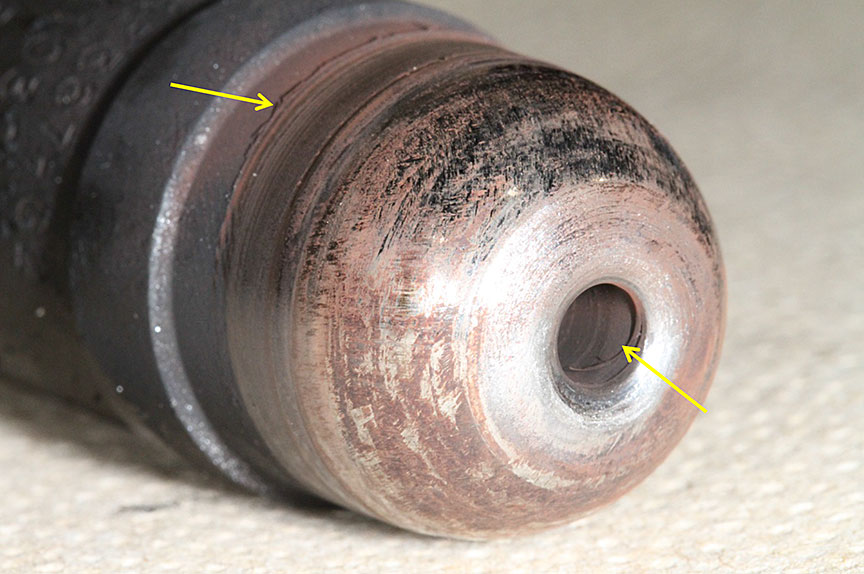 Removal of the intake manifold body from PA R5 showed that the intake valve stems were present but bent (Figures 17 and 18). Removal of PA R5 revealed extensive damage to the piston crown, consistent with repeated interaction with the valves (Figure 19). A valve stem sized hole had been punched through the center of the piston crown and the edges of the dished portion showed batter. The remainder of the piston was unremarkable. The intake pushrod had bent (Figure 20). The combustion chamber for PA R5 was damaged (Figure 21). Both exhaust valve heads were separated from their stems; one head was found jammed in the exhaust port (Figure 22). Both intake valves were impact damaged such that they no longer seated properly. Although the rockers moved easily, removal of the rocker shafts from the PA required the use of a hammer and brass drift, consistent with partial seizure. The shafts and bearings were dry on either end where they mated with the PA. The center portions of the shaft had a paste-like coating of oil residue (Figure 23).