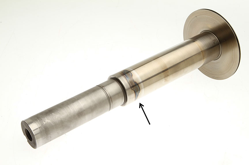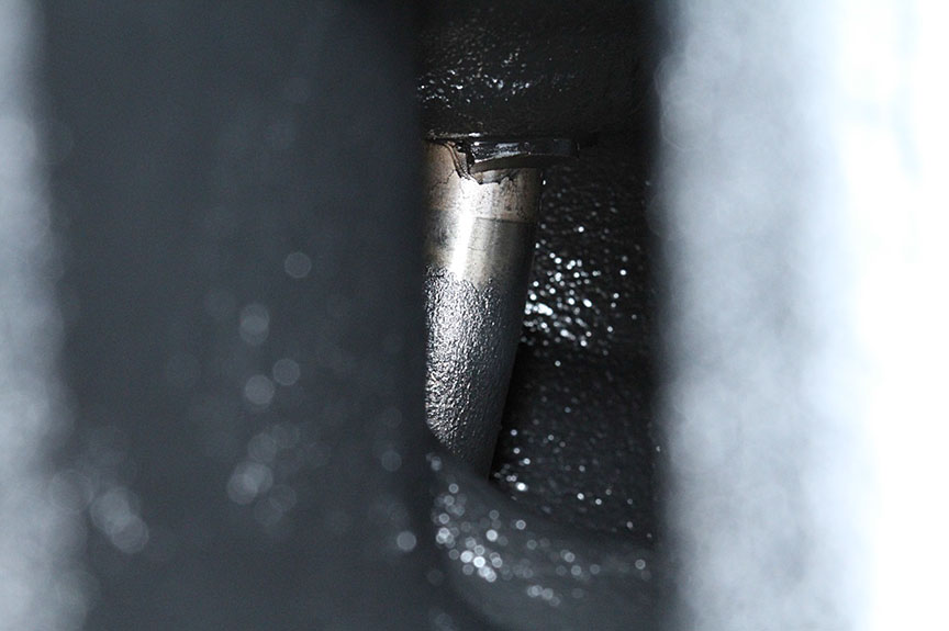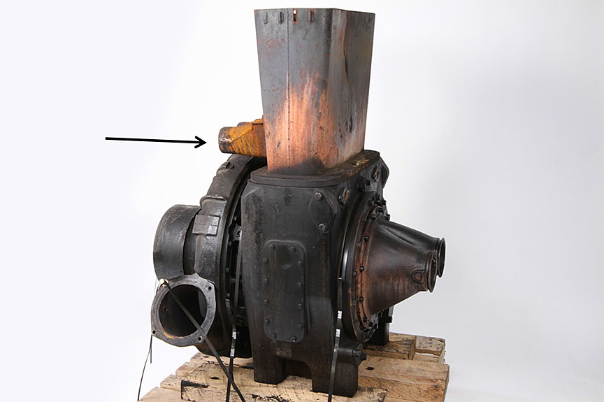 Re-assembly of the exhaust stack and turbocharger out of the locomotive showed the location of the fire with respect to the aspirator venturis in the exhaust stack (Figure 26). The paint and deposits on the body of the turbocharger had not been damaged by the fire whereas the area around the venturis and the lower portion of the exhaust stack were extensively fire damaged as shown by their rusty colour. Removal of the transition section from the turbocharger showed a buildup of oily deposits on the exhaust side (Figure 27). A fragment of valve stem was observed just upstream of the turbine (Figure 28).
