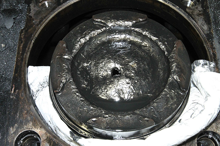 The damaged valves and piston crown allowed engine oil to flow into the R5 cylinder, into the intake and exhaust manifolds and to collect in the body of the turbocharger.