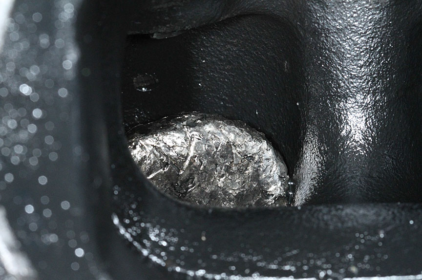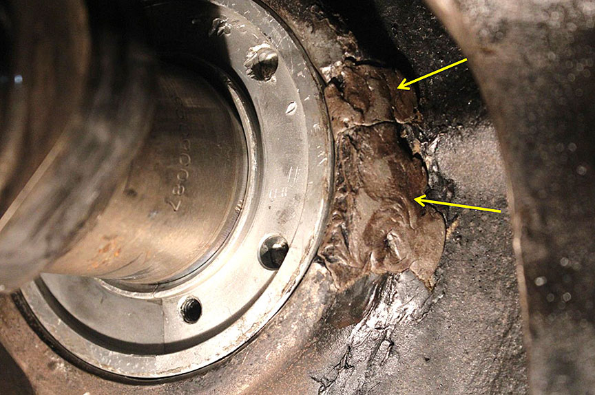 Cleaning of the area around the failed R4/R5 cam bearing revealed that the cam bearing bore had been previously repaired with a polymeric material (likely some type of epoxy) (Figure 36). A portion of the engine frame adjacent to the cam bearing bore had been broken away and replaced with this polymeric material. The repaired area had failed and some of the polymeric material was missing.