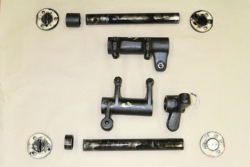 PA R4 and PA R6 were removed for examination. These assemblies were unremarkable apart from some differences in colour. The piston crown of R6 was oily and darker than the colour associated with normal operation. The piston crown of R4 was dry but still a little darker than normal (Figure 24). Removal of the rockers and rocker shafts showed that they were well lubricated and slid apart with ease (Figure 25).