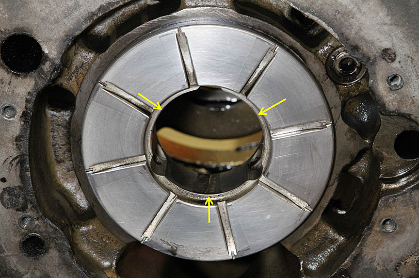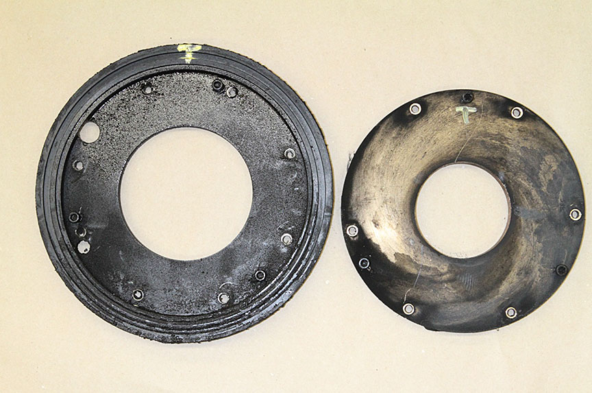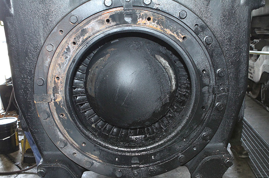 Disassembly of the turbocharger showed that approximately 12 of the 70 turbine blades had fractured (Figure 29). The turbine and compressor journal bearings and shaft showed wear damage, primarily on the compressor side (Figures 30 through 34). The wear areas on both the turbine and compressor bearings occurred in three locations radially around the bore of the bearings, between the three equally spaced oil delivery ports. A large quantity of dense oil sludge was found in the body of the turbocharger indicating that oil had been collecting in the turbocharger for some time. However, the oil seals for both the compressor and turbine bearings were in good condition and there was no sign of abnormal leakage (Figure 35).