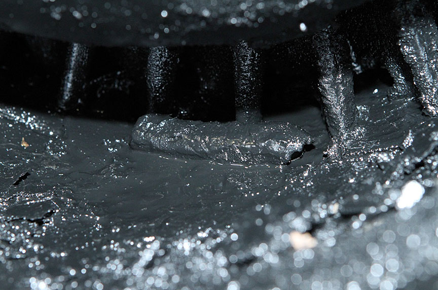 Initial field examination of the engine bay of MMA 5017 showed that engine oil had been dispersed inside the engine covers as well as outside, primarily near the turbocharger end of the engine. It could not be determined how much engine oil had been present in the engine bay prior to the fire, nor the extent to which this oil was disturbed in the act of extinguishing the fire. However, a significant amount of engine oil was observed all around the forward end of the engine (Figure 1).