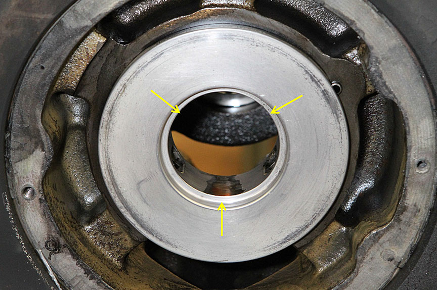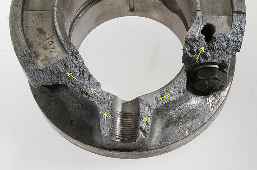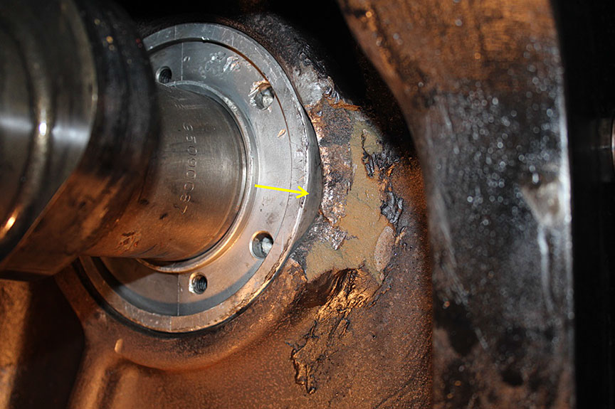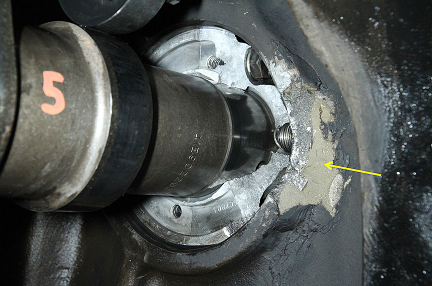 Removal of the crankcase inspection cover for PA R5 showed that the camshaft bearing between PA R4 and PA R5 was broken (Figure 6). A large section of the camshaft bearing had separated exposing the camshaft journal.
