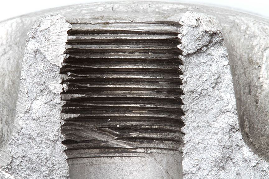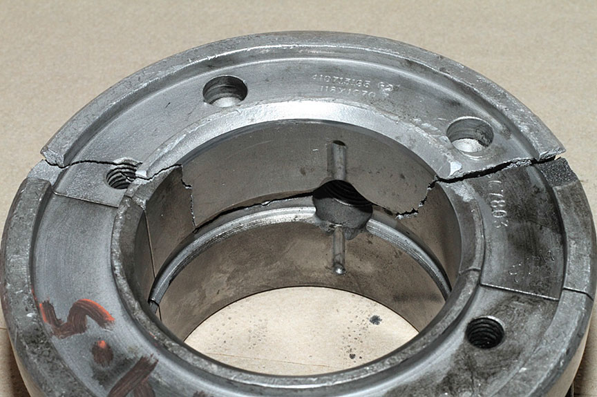 The failed cam bearing had fractured at the mounting bolt hole (Figures 41 and 42). The fracture surface had a rough appearance with ridges pointing back to the outboard end of the bolt hole. This indicates that this was an overstress fracture that had initiated at the mounting bolt hole (Figure 43). No sign of progressive fracture was observed. The R4/R5 cam bearing is manufactured of aluminum alloy with a helical thread steel insert to accept the mounting bolt. Localized thread damage in both the separated portion and the remaining portion of the bearing (Figures 44 through 47) indicate that the fracture originated at the top and bottom of the mounting hole when the material surrounding the steel thread insert was overloaded axially in the outboard direction. The final portion of the thread insert itself was also deformed in the axial direction (Figure 48). The outboard edge of the separated section of bearing had contacted the camshaft resulting in a localized smear (#figure-49 ). These observations suggest that the bolt was over-tightened, overloading the cam bearing material around the threaded insert and causing its overstress fracture at the bolt hole.