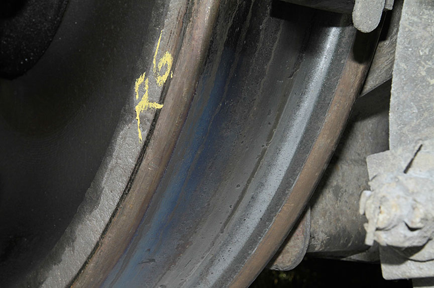 All 68 wheels were examined for rim thickness and tread surface discolouration. Rim thickness was measured using an AAR wheel rim thickness gauge. All of the VB car wheels exceeded the specified ¾ inch minimum rim thickness for 33-inch freight wheels.Footnote 1 All of the locomotive wheels were above the 1 inch minimum rim thickness for locomotive wheels in road service.Footnote 2 The results are recorded in 16ths of an inch under the columns titled Wheel Rim in Appendix A.