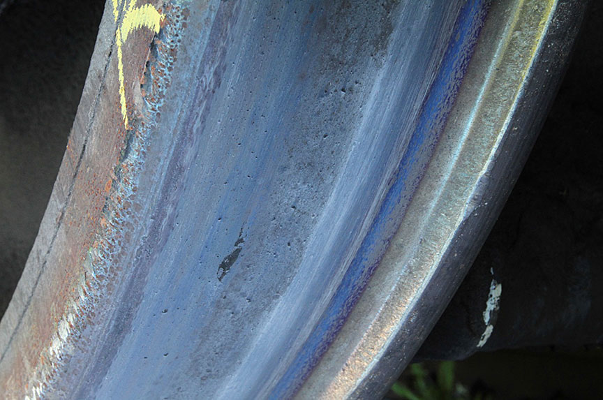 Blueing is a blue discolouration of steel surfaces that is indicative of exposure to heat. On railway wheels, tread blueing is caused by the frictional heat generated during a heavy or extended brake application. A qualitative scale was used to characterize the amount of blueing observed on the wheel tread: no blueing = 0, ¼ of the wheel tread = 0.25, ½ of the wheel tread = 0.5, ¾ of the wheel tread = 0.75 and full tread blueing including the flange = 1. Figures 1 through 4 show representative examples of the different amounts of blueing observed. The results are recorded under the columns titled Tread Blueing in Appendix A.