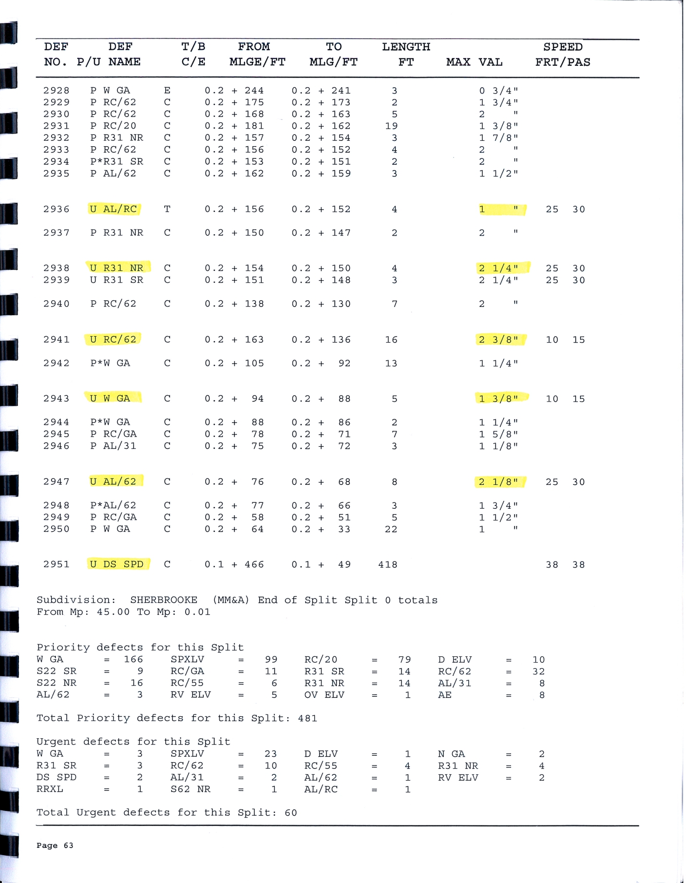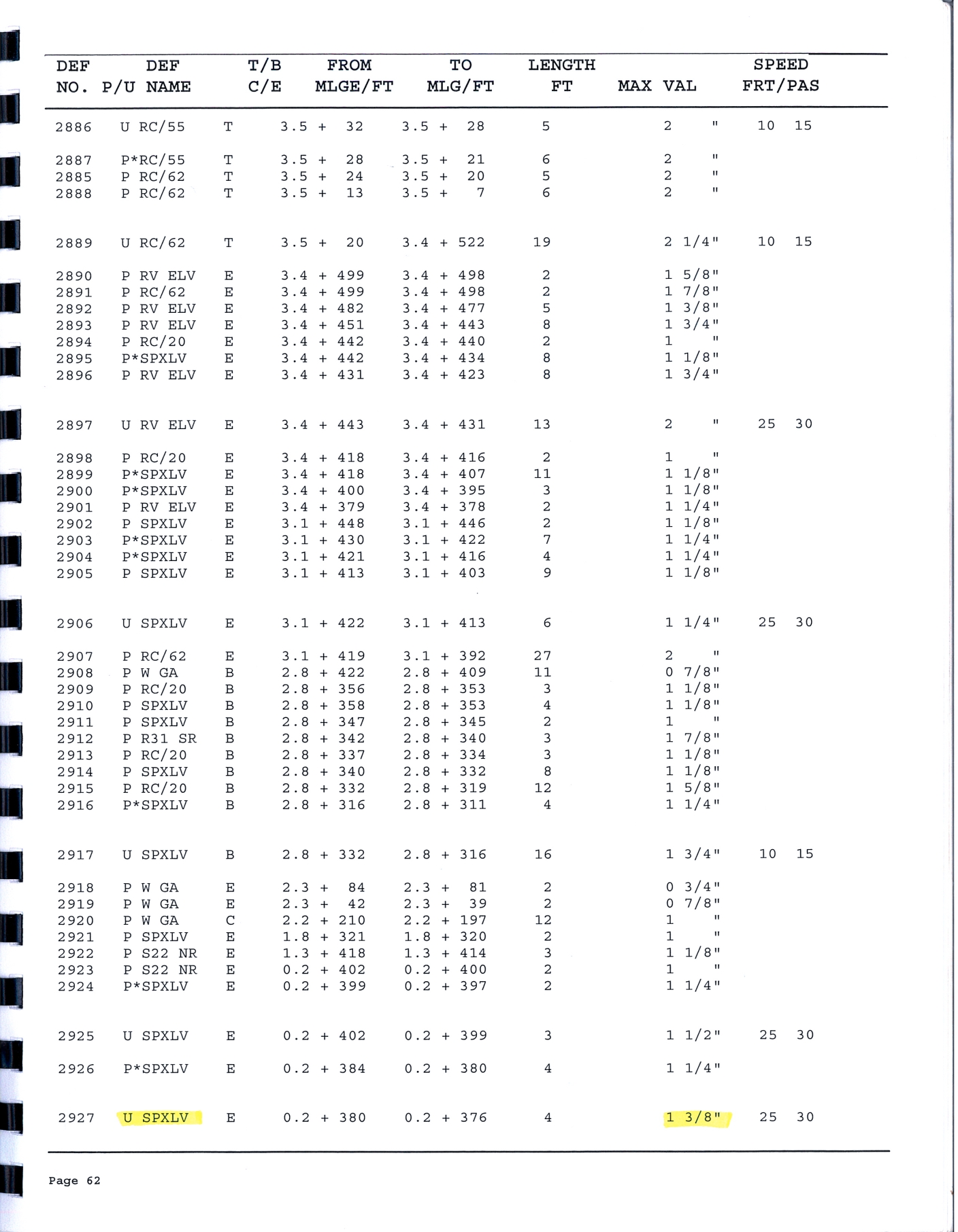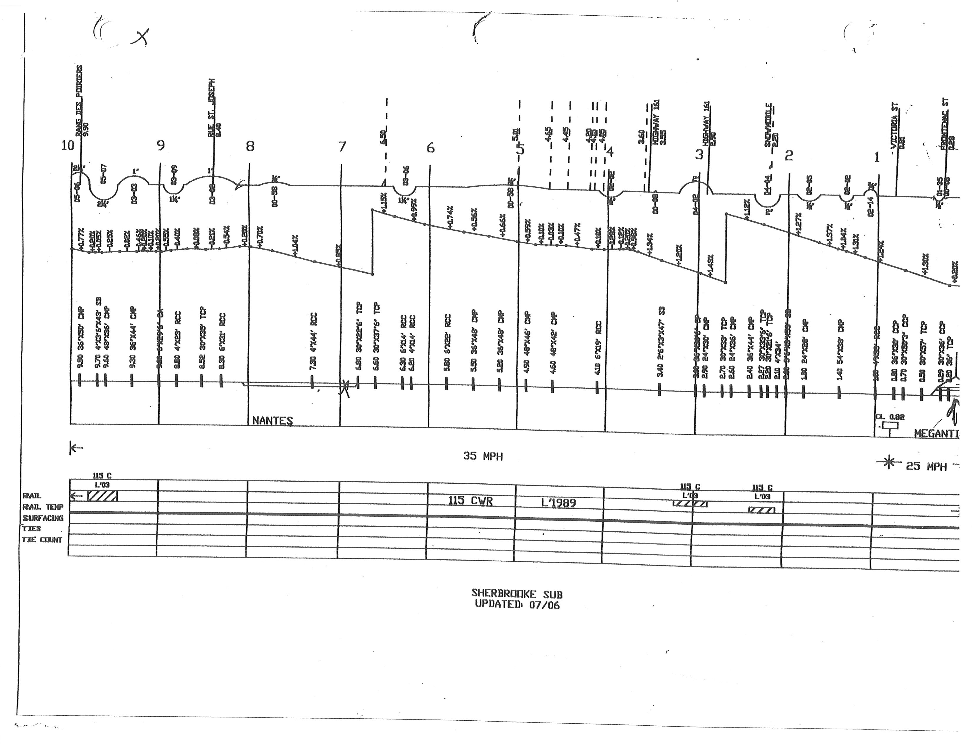 The average superelevation in the 4.25° curve located from Mile 0.05 to Mile 0.28 was about 1 ½ inches, corresponding to a balanced speed of 22 mph. Typically, for freight trains negotiating this degree of curvature with the superelevation that existed, train speed should not exceed 32 mph (assuming a maximum of 1 ½ inches of underbalance).