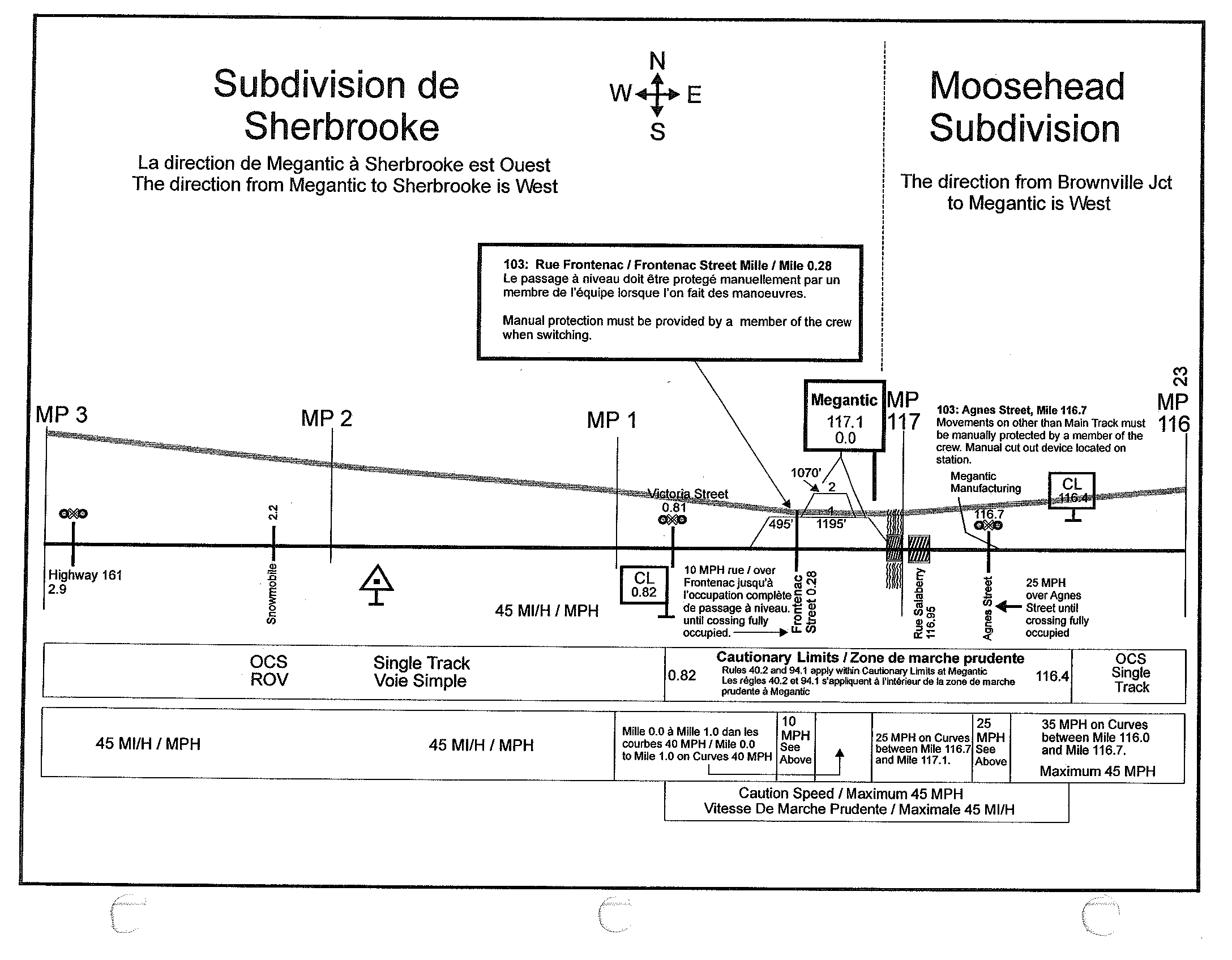 The train was operated by a 1-person crew. Before midnight, it came to a stop on the main track of Station Nantes with an automatic application of the air brakes. The locomotive engineer applied hand brakes on the locomotive consist and the buffer car, and then released the automatic brake, but kept the independent brake (IND) of the locomotive consist in the applied position. The engine of the lead locomotive, MMA 5017, was kept running at idle to maintain the air brake supply. The locomotive engineer left the train and went to a hotel for rest, as indicated in his schedule.