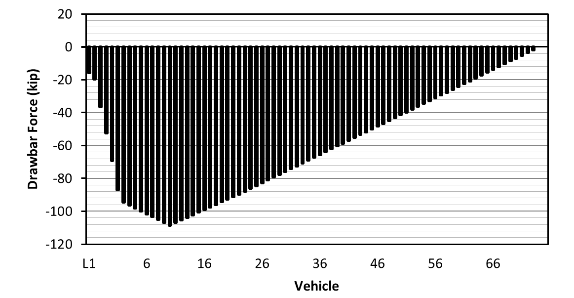 The simulated in-train buff forces at the derailed tank cars were approximately 100 to 110 kips, which alone would not cause derailment of the loaded vehicles in the occurrence.