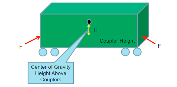 Vehicles may roll over outward on curves at high speeds because of excessive centrifugal force, as shown in Figure 3. The critical condition occurs when the compound force resulting from the centrifugal force and the gravity force points to the high (outer) rail so the low (inner) wheel will be lifted from the low rail. Under the critical condition, the following equation exists: