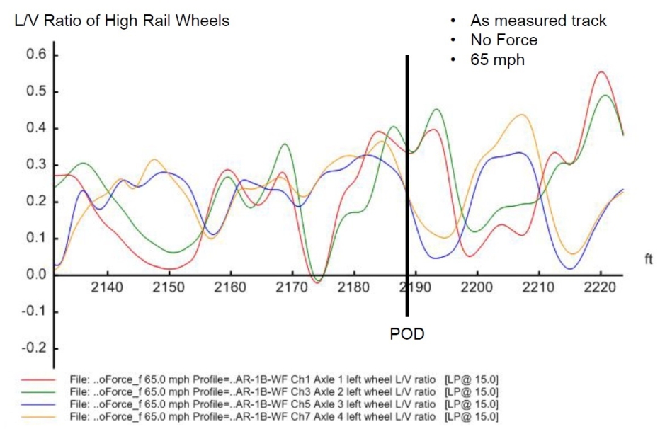 The track geometry condition at the POD on the day of occurrence could not be determined quantitatively. If the track geometry defects recurred to the levels noted in the previous inspection, they could generate significantly high dynamic forces, contributing to the derailment.
