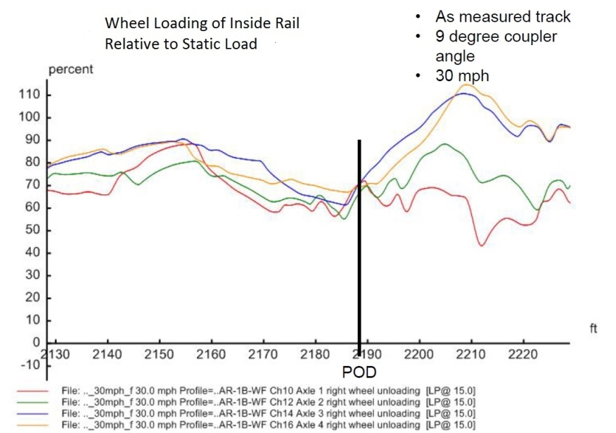 The TÜV Rheinland Mobility Inc. Rail Sciences Division (TRRSI) was contracted to conduct a VAMPIRE vehicle/track dynamic simulation to evaluate the effect of the track geometry. A generalized tank car model developed by TRRSI was used. As the track and derailed cars were destroyed, it was not possible to obtain the actual wheel and rail profiles of the first derailed car at the POD. Standard AAR wheel and rail profiles were used in the simulation.