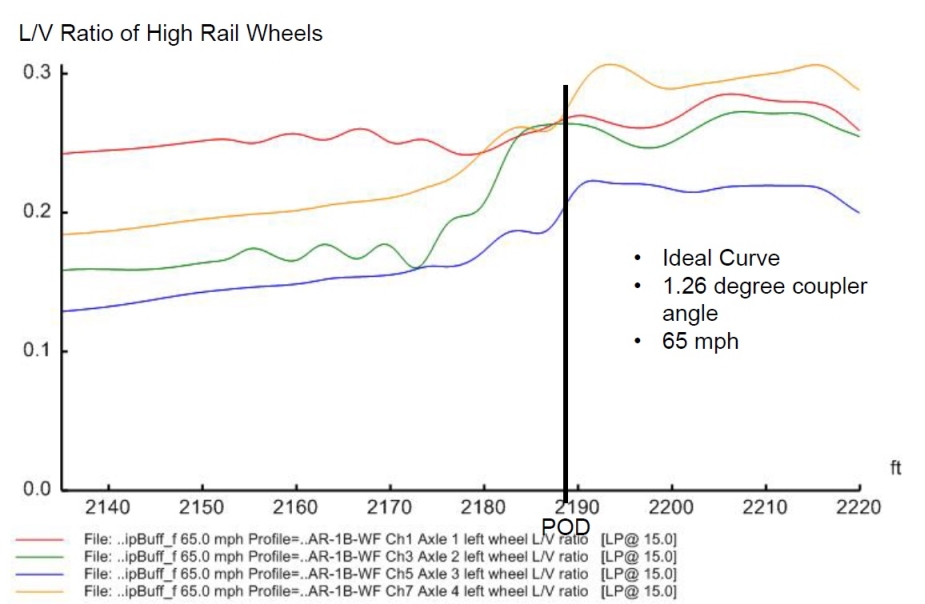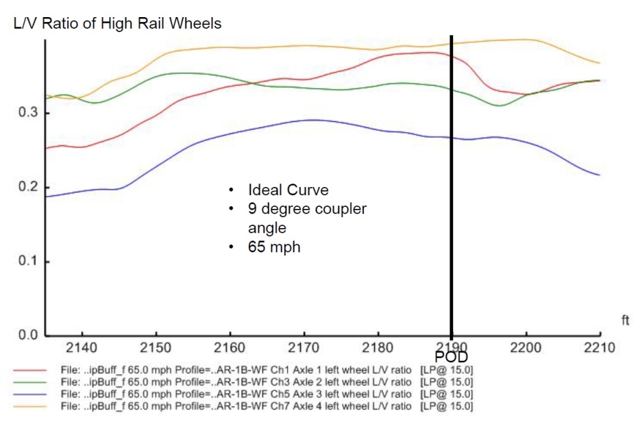 A laboratory project was opened for calculation of the lateral force and the rollover speed at the POD curve. The preliminary calculation indicated that the derailment speed was lower than the rollover speed due to the pure centrifugal force on the curve for the derailed tank cars. A further simulation was conducted to obtain the longitudinal in-train force at the derailment moment and the corresponding transformed lateral force. The combination of the centrifugal force and the transformed lateral force of the in-train buff force could cause the derailment if the couplers and the tank car were in jackknifed position.