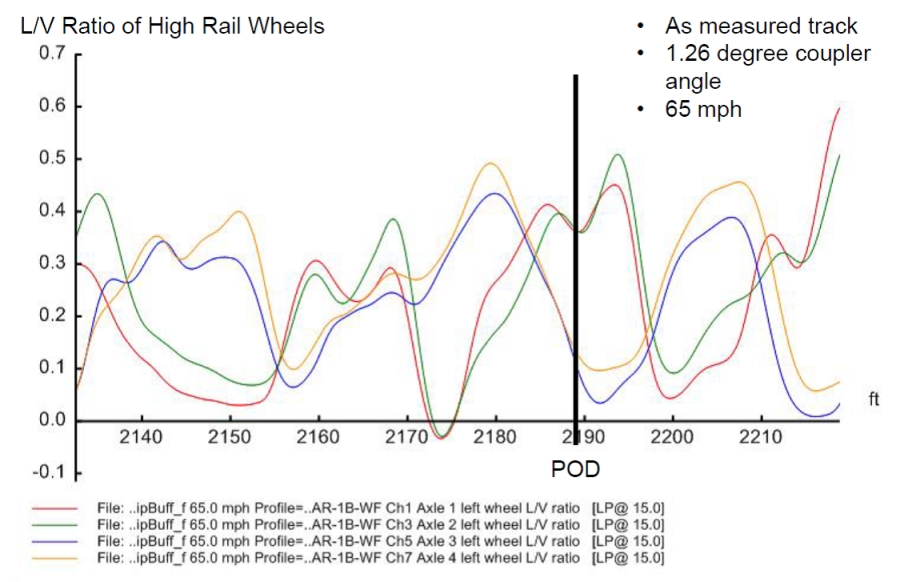 The speed is critical to the centrifugal force and the dynamic force generated by the track geometry. At 30 mph, the contribution from the three factors would result in derailment indicators well below the derailment thresholds.