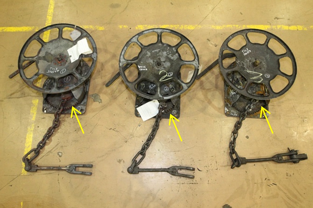 Figure 1. Three handbrakes as received, front view. Note position of upper chain attachment point (arrows)