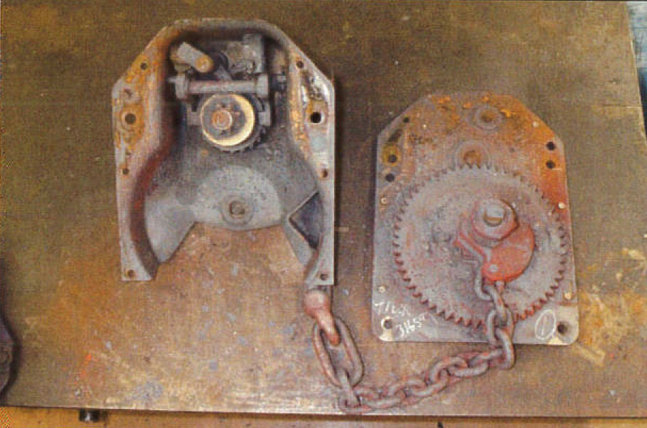 The three handbrakes were photographed as received before examination (Figure 1). The handwheels from handbrakes 1 and 2 had been previously removed prior to shipping to the TSB laboratory but were temporarily replaced for the photographs. It is not known whether the handbrakes had been operated following the occurrence. The three handbrakes were in the released position with the upper chain attachment point clearly visible. White paint residue was visible at the upper chain attachment point on all the handbrakes although mostly removed due to fire damage on number one (Figure 2). The back plate of handbrake number 1 showed deformation (Figure 3) whereas the other two did not. The handwheel and release handle were removed from each handbrake. The nut used to secure the release handle had been welded to its shaft in each case and had to be cut before removal. The heads of the solid rivets used to join the front housing to the back plate were cut using an abrasive disc and the housing was lifted off (Figure 4).