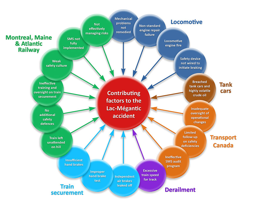 The investigations conducted by the Transportation Safety Board of Canada (TSB) are complex, and it is never just one factor that causes an accident. The July 2013 train accident in Lac-Mégantic, Quebec, was no exception. There were many factors that caused this accident, the details of which are contained in the 18 findings as to causes and contributing factors. Furthermore, there were 16 additional findings as to risk as well as 6 other findings.