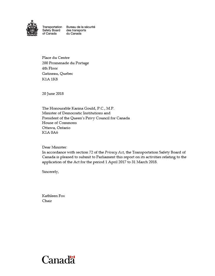 Pursuant to section 72 of the Privacy Act, the Transportation Safety Board of Canada (TSB) is pleased to table in Parliament this report on its activities relating to the application of the Act. The report covers the period from 1 April 2017 to 31 March 2018.