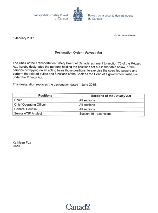As required by the legislation, a delegation of authority is in place. For the purposes of the Privacy Act, the “head of the institution” as defined in section 3 of the Act is the Chair of the TSB. The incumbents of the positions of Chief Operating Officer, General Counsel, and Senior ATIP Analyst have been delegated powers by the Chair deemed appropriate for the effective administration of the Act. These employees ensure that the TSB meets all its obligations fairly and consistently. The delegation authority remained the same in 2018–19. A copy of the delegation order is attached as Appendix A.
