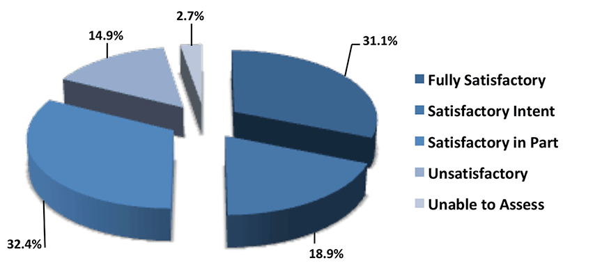 The Board had assessed another 6.2% of the responses as Satisfactory Intent. This indicates that change agents were taking or had planned to take action that, when fully implemented, would substantially reduce the safety deficiencies. In 9.6% of cases, the Board had issued a rating of Satisfactory in Part, which means that change agents were taking or had planned to take action that would not substantially reduce or eliminate the deficiencies. The Board had assessed 3.4% of responses as Unsatisfactory, since change agents had not taken or were not planning to take action that would address the deficiencies, or the planned action was taking too long. In the remaining cases, the Board had received insufficient information to be able to assess the response, or the recommendations were too new and had yet to be assessed.
