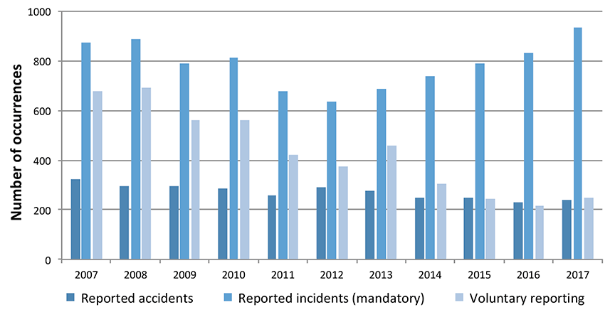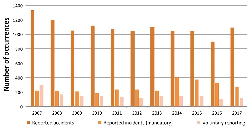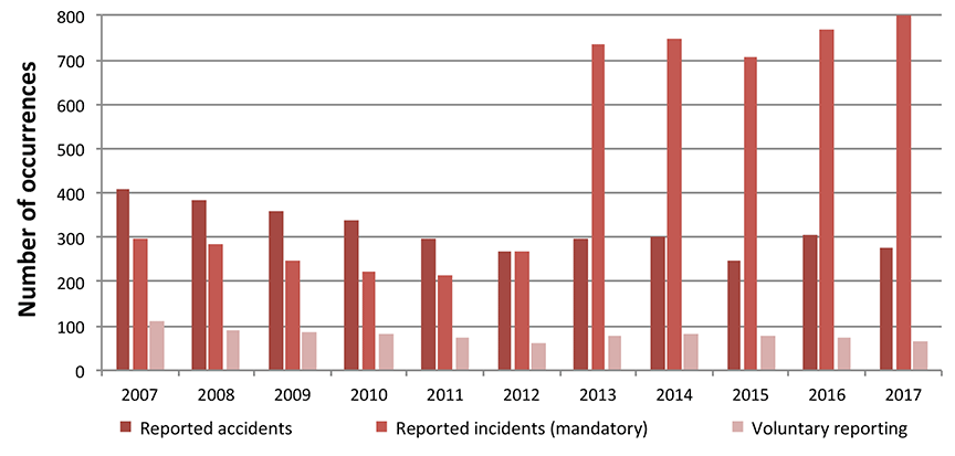 After a consistent downward trend since 2013, the overall number of occurrences reported rose in 2017, despite improvements in some sectors.Footnote 1 In 2017, 1,614 accidents and 2,210 incidents were reported in accordance with the TSB's regulations for mandatory reporting of occurrences (Figure 2).Footnote 2