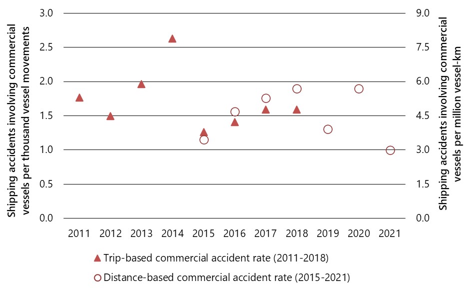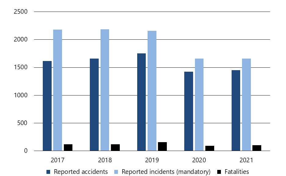 In 2021, there were 1450 accidents reported, 2% above the 2020 total of 1422, but 9% below the 10-year average of 1597.