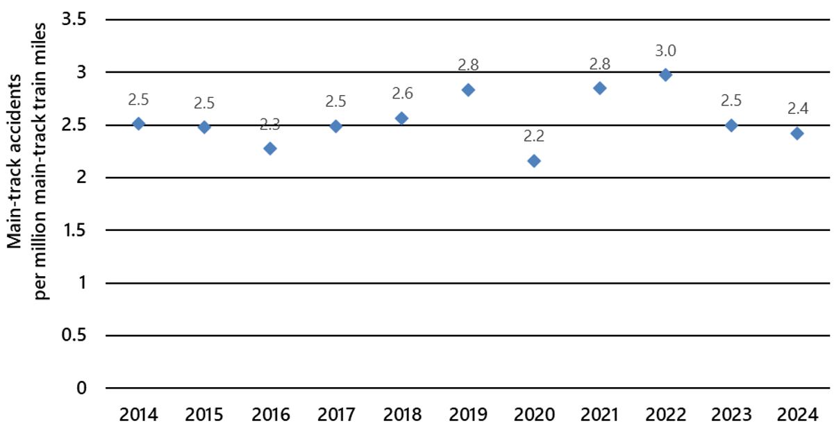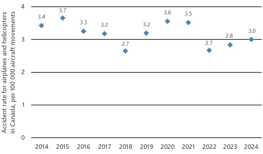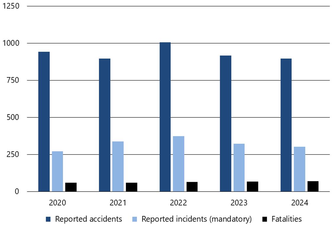 Of the 3222 reported occurrences, 1303 were accidents, which is 3% below the 2023 total of 1342, and 14% below the 10‑year average of 1507; and 1919 were incidents, which is a 5% decrease from the 2023 total of 2014, and 5% less than the 10-year average of 2014.