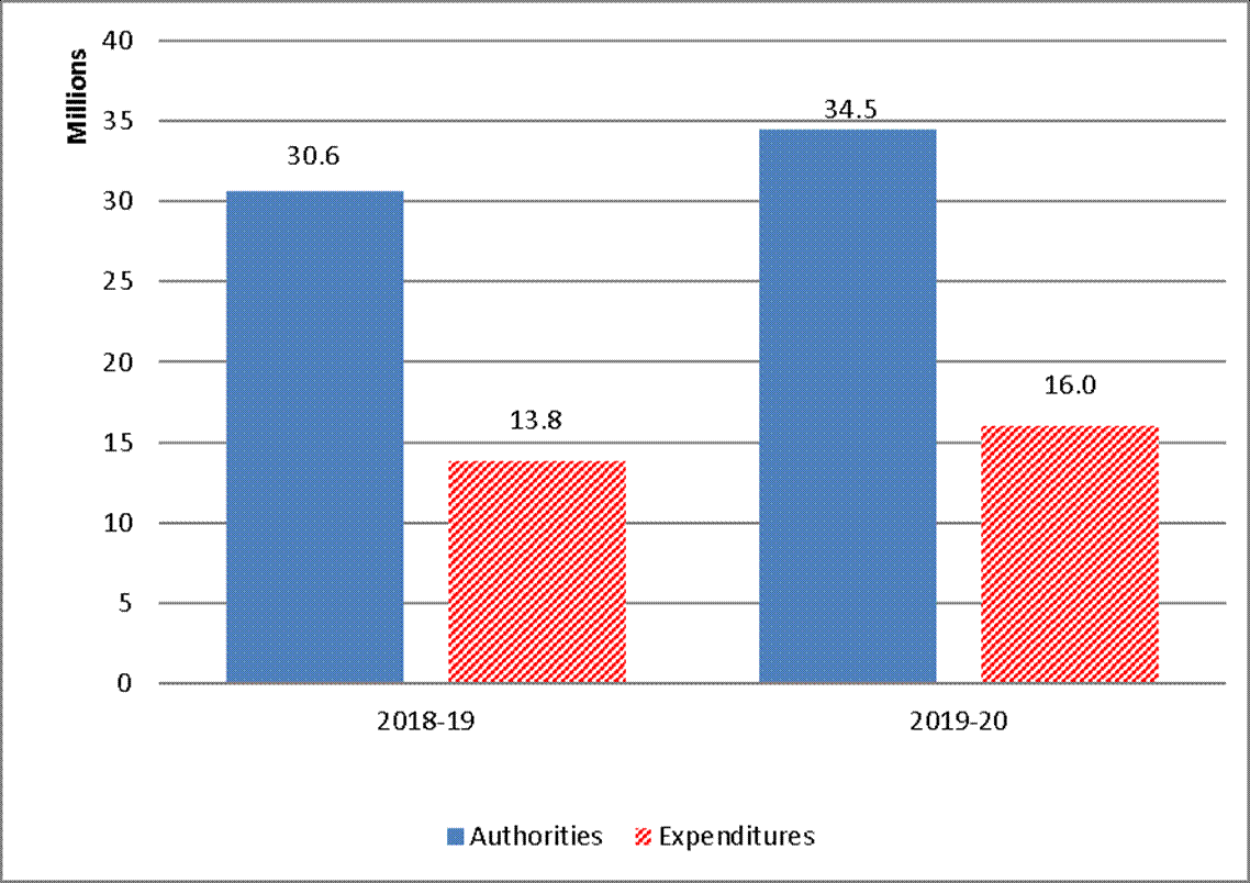 The TSB’s total authorities available for use increased by $3,869,643 between fiscal years 2018-19 and 2019-20. The majority of this difference is due to an increase in permanent funding of $2,977,444 allocated to the TSB in the third quarter of 2018-19. This amount was obtained through a Treasury Board Submission in response to the TSB’s program integrity funding pressures. In addition, the TSB had a higher OBCF of $762,197 compared to previous year. The remaining increase is attributed to compensation adjustments for signed collective agreements, which is offset by a lower Employee Benefit Plan (EBP) percentage. This EBP percentage fluctuates from year to year and is a rate set annually by the Treasury Board Secretariat.