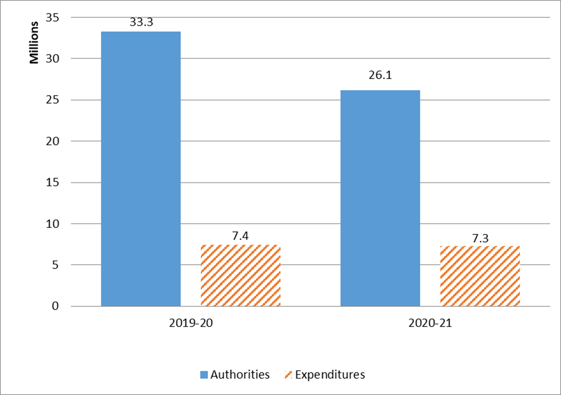 The TBS’s total authorities available for use decreased by $7.2 million between fiscal years 2020-21 and 2019-20 due to the reduced supply of the Main Estimates. As a result of the COVID-19 pandemic and limited sessions in the spring for Parliament to study supply, the Standing Orders of the House of Commons were amended to extend the study period into the Fall. This means that the authorities available for use presented in this report represent only 75% of the TSB’s Main Estimates and are therefore not comparable to previous year for which full supply was received. The TSB is expected to receive full supply for the 2020-21 Main Estimates in December 2020.