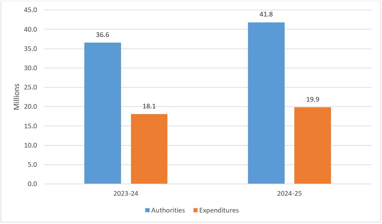 The TSB’s total authorities available for use increased by $5.2 million between fiscal years 2023-24 and 2024-25. This is mainly due to a timing difference in the receipt of additional funding between fiscal years. The TSB obtained new funding through Budget 2023, which provided funding for critical TSB operations, most notably the hiring of additional investigators as well as funds for crucial IT investments. Additionally, the TSB received funding for employee salary increases resulting from newly signed and ratified collective bargaining agreements. Although funding for these items were received in both fiscal years, in 2023-24, it was received only in the third quarter, which explains the large difference when comparing second quarter authorities year to year. The Government of Canada’s Refocusing Government Spending initiative also had an impact, although the difference in the amount between years is minor.