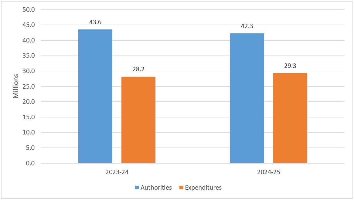 The TSB’s total authorities available for use decreased by $1.3 million between fiscal years 2023-24 and 2024-25, driven by several key factors. The TSB secured new funding through Budget 2023, which allocated one-time resources for critical TSB operations, most notably for essential IT investments. Additionally, the TSB received funding to support employee salary increases resulting from newly signed and ratified collective bargaining agreements. While funding was received in both fiscal years for these items, the 2023-24 funding included retroactive payments for most TSB employees, resulting in a slightly higher amount compared to the 2024-25 allocation. Furthermore, the TSB’s operating budget carryforward (OBCF) for 2024-25 was slightly lower than the amount carried forward in the prior fiscal year. The Government of Canada’s Refocusing Government Spending initiative also had a minor impact, although the variation between the two years was minimal.
