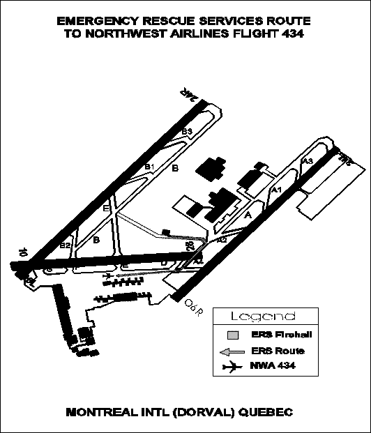 The Dorval airport has three runways: runway 10/28 and the two parallel runways 06/24. The ERS building is located between the two parallel runways with direct access to their respective taxiways, Alpha and Bravo. Those two taxiways intersect the third runway, 10/28, and further on, the ramp area with its two terminal buildings which are all parallel to runway 10/28. There is no direct access from the ERS building to the ramp area. Another taxiway, Echo, joins taxiway Bravo to the ramp. (See Appendix A.)