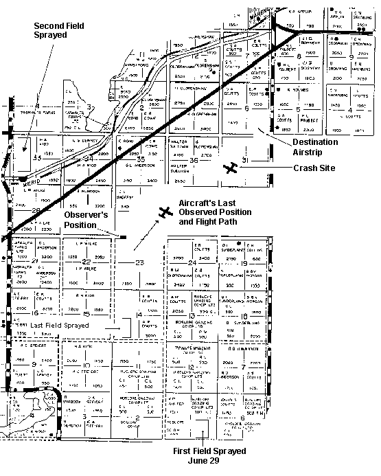 The aircraft had been observed in straight and level flight at an altitude of about 500 feet agl approximately two miles southwest of the crash site. At that time, the aircraft was headed in a northeasterly direction; nothing unusual was noted about the aircraft or its flight characteristics. The wreckage of the aircraft was located in a field of cereal grain about one mile from the aircraft's destination, in gently rolling cultivated terrain.4 There were no power lines or other obstructions nearby.