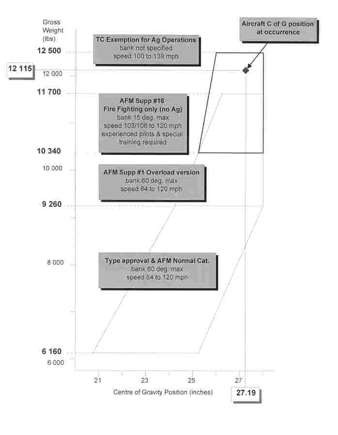At the time of the occurrence, the aircraft was configured with wing-mounted spray booms for the application of liquid chemicals, and was being operated at a weight of approximately 12,115 lb with a centre of gravity (C of G) at 27.19 inches aft of datum.